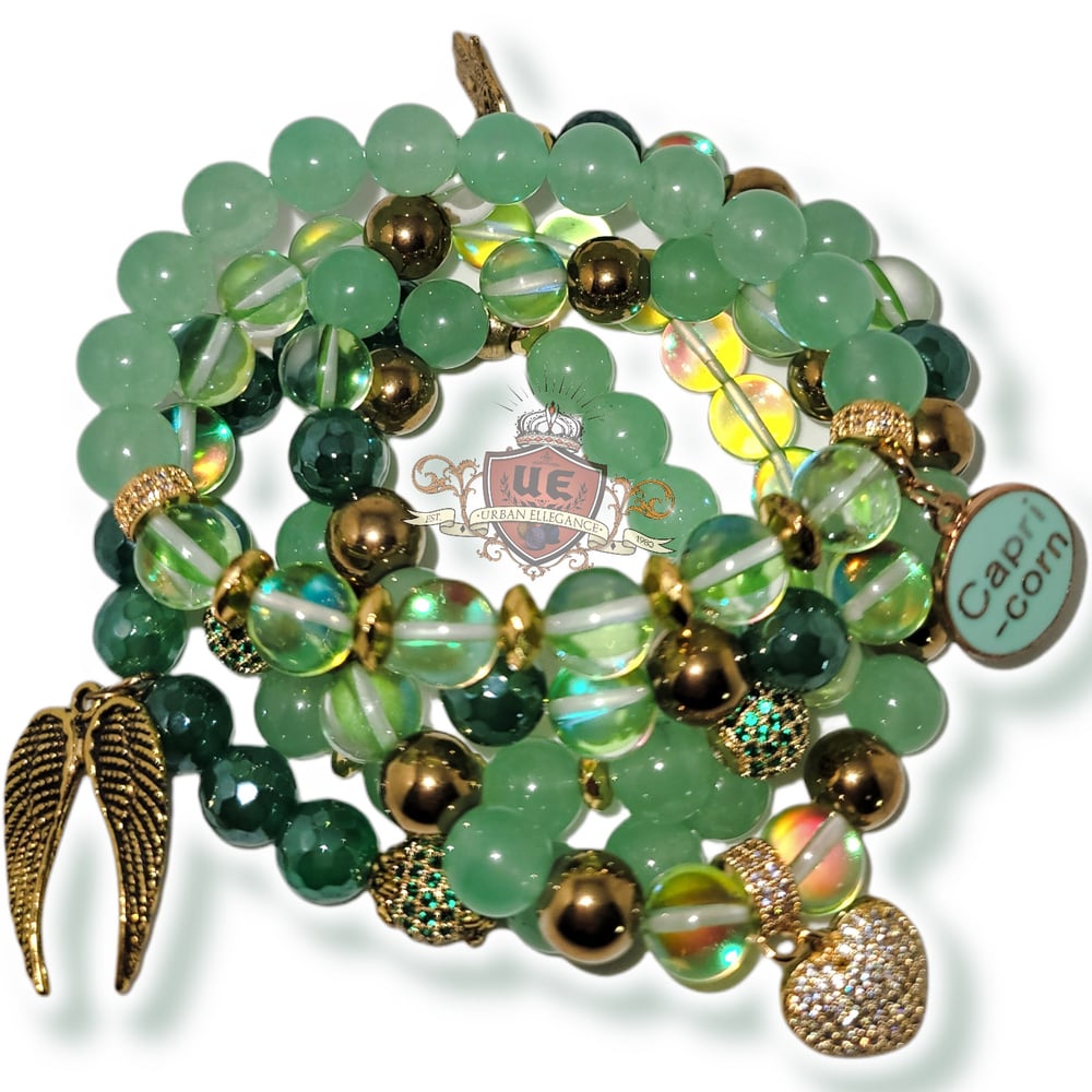 The green aventurine,agate and jade stones bounce off the highgrade sparkling Chinese AB Green quartz and create a beautiful yellow hue next to the gold hematite highlights and splashes of highgrade micro pavé. Green micro pavé were added for depth.The charms are a variety of non tarnishing micro pavé heart, zodiac of your choice Angel wings, and Hamsa.