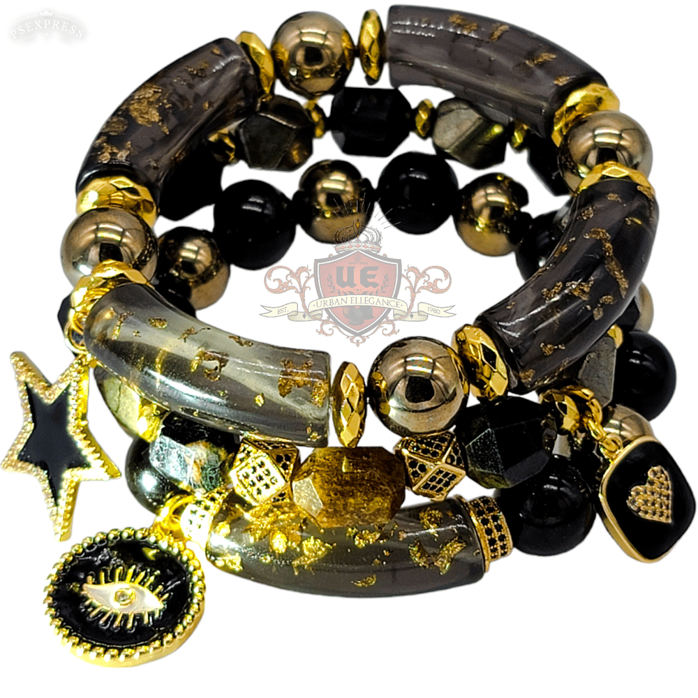 Stunning 3 peice set with 1 full bangle in a Smokey Black hue with gold foil highlights and pyrite stones, 1 half bangle with beautiful golden obsidian and pyrite and 1 fully beaded bracelet in thee most majestic,high quality beautifully cut Black tourmaline w/ Gold Mica inclusions and pyrite w/ Hematite Highlights. Beautiful black acrylic charms and This is a chunky 12mm set! Sure to turn heads