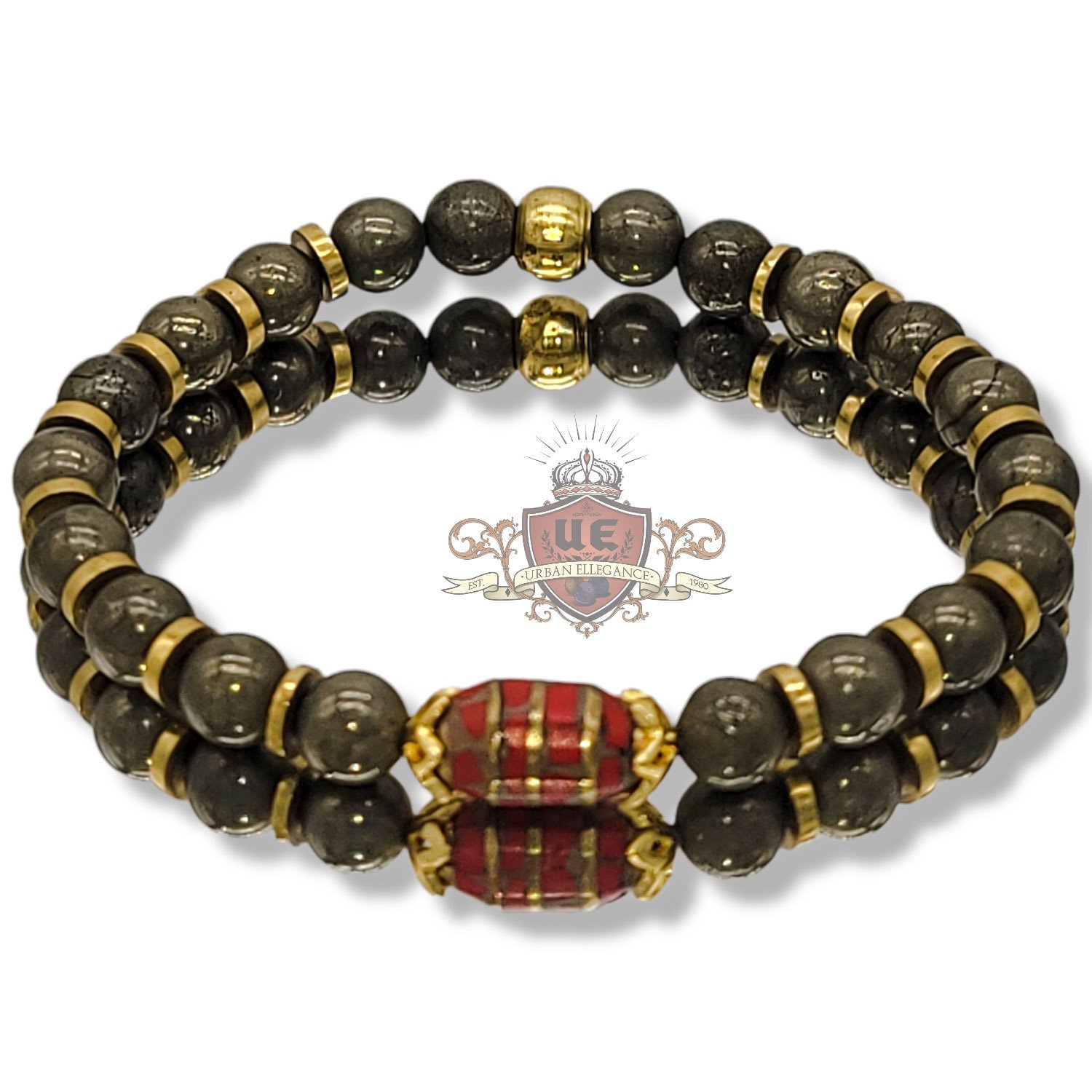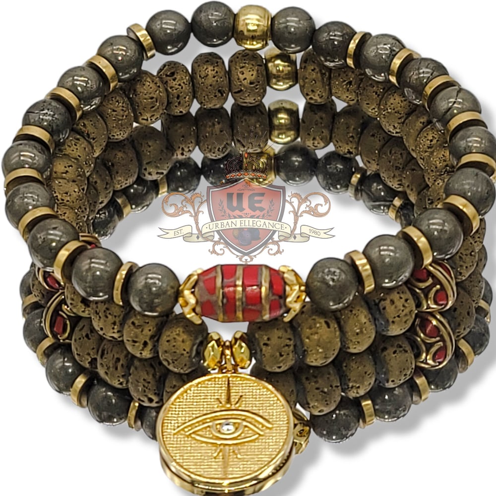 Rugged Gold Tone Fossil Bracelet w Stainless Steel Eye Charm and Tibetan Coral highlight beads paired with Smooth pyrite w/ African Brass highlights and Tibetan Coral center focal bead.