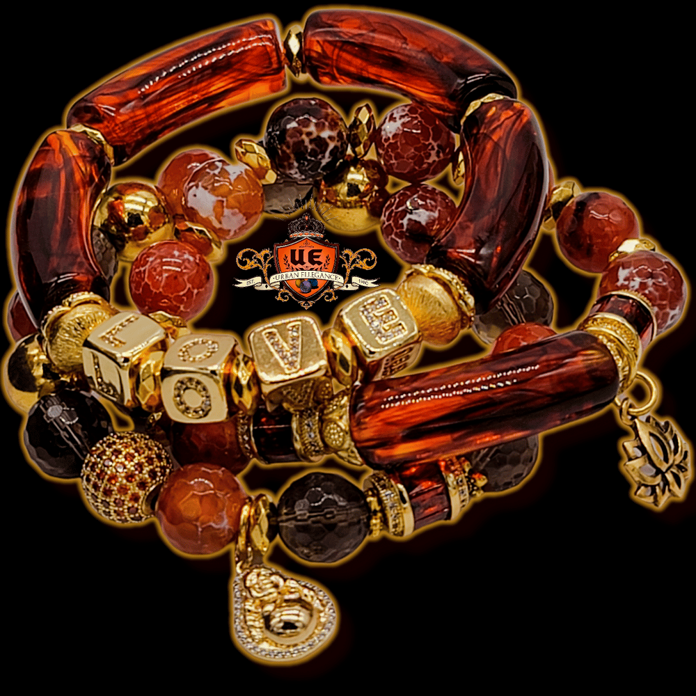 Stunning 3 peice set with 1 full Love spell out bangle in Tortoise hue, 1 half bangle with Amber toned Agate and and 1 beaded bracelet with Amber Agate, Smoky Quartz and Gold Hematite Highlights. Beautiful Gold,Happy Buddha charm and Lotus charm and Micro pavé highlights this is a chunky 12mm set! Sure to turn heads